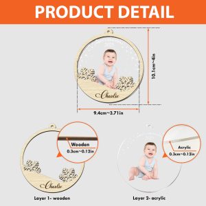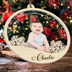 Capture the magic of your baby’s first Christmas with our high-quality personalized photo wood and acrylic ornament. Customized with your precious newborn’s photo, this beautiful keepsake celebrates the joy of this special season. The charming ‘Baby’s First Christmas’ design, complete with a delicate snowflake, adds an extra touch of wonder. It’s not just an ornament; it’s a heartfelt gift for your family, grandparents, mom, dad, or a cherished memento for your little one. Make this holiday unforgettable with a perfect ornament that marks a momentous occasion.