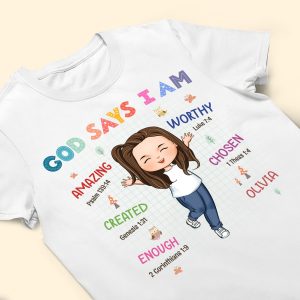 Empower your child with positivity through the ‘God Says I Am’ personalized shirt. Designed especially for kids, this shirt carries motivating messages like ‘You Are Important,’ ‘Kind Loved Worthy,’ and other uplifting quotes. It’s not just a piece of clothing; it’s a daily dose of inspiration. This shirt makes a thoughtful gift for moms too, blending the elements of an inspirational and religious shirt. Nurture your child’s self-esteem with this blend of fashion and motivation, reminding them of their inherent worthiness. Wear the goodness of positive affirmations! Perfect Birthday gift, Back to School gift, Christmas gift, Thanksgiving Gift or any occasions present idea for your loved kid, grandson, son, daughter, granddaughter.