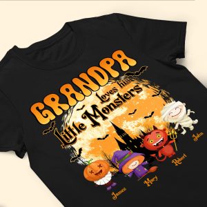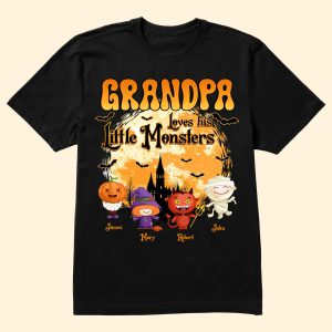 Crafted from soft, comfortable fabric, this shirt is perfect for wearing during Halloween festivities or any day of the year. The playful design showcases each grandchild as a cute little monster, adding a fun and personalized touch that Grandpa will cherish.
