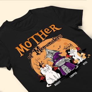 If so, this personalized shirt is perfect for you! This shirt features the text ‘Mother of meownsters’ in a spooky font, along with a cute cat face and some bats. It’s a funny and adorable way to show off your love for your cats and celebrate the Halloween season. You can customize this shirt with your choice of color, size, and cat breeds.