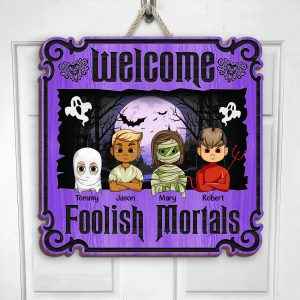 Welcome guests to your perfect home with our Welcome Foolish Mortals wood sign which is a special version for Halloween! Ideal for any family with kids. This whimsical sign allows you to proudly display your love for your home right at your door.