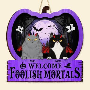 Welcome guests to your perfect home with our Welcome Foolish Mortals wood sign which are special versions for Halloween! Ideal for any cat mom, cat dad, or feline fanatic. These whimsical mats allow you to proudly display your love for all things cats right at your doorstep.