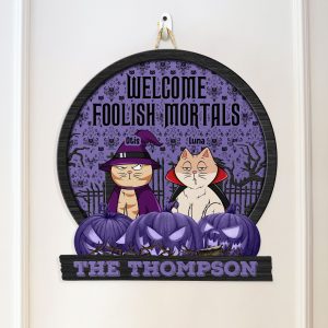 Welcome guests to your perfect home with our Welcome Foolish Mortals wood sign which are special versions for Halloween! Ideal for any cat mom, cat dad, or feline fanatic. These whimsical mats allow you to proudly display your love for all things cats right at your doorstep.