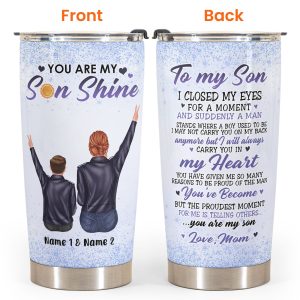 Show your son how much he means to you with a custom tumbler just for him. With fun designs and personalization, this stainless steel tumbler makes a thoughtful gift to celebrate the amazing young man he’s becoming. This tumbler makes a great birthday, graduation, sport season or just-because gift to recognize his passions and accomplishments. Whether he’s artistic, athletic, academic or all of the above, this tumbler celebrates his unique spirit. The personalized details make it a gift as cool as he is. Surprise your remarkable son with a tumbler as vibrant and fun as his future. He’ll love showing off his one-of-a-kind cup to friends. Let it serve as a token of love and appreciation as he navigates his journey through life.